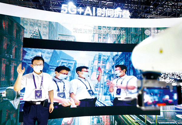 2021中国国际数字经济博览会上,工作人员在展示5G+AI时间折叠技术,该技术可以实现人物实时抠像,将影像合成到一起后,实现三个“自己”相互打招呼。 新华社记者 王晓 摄