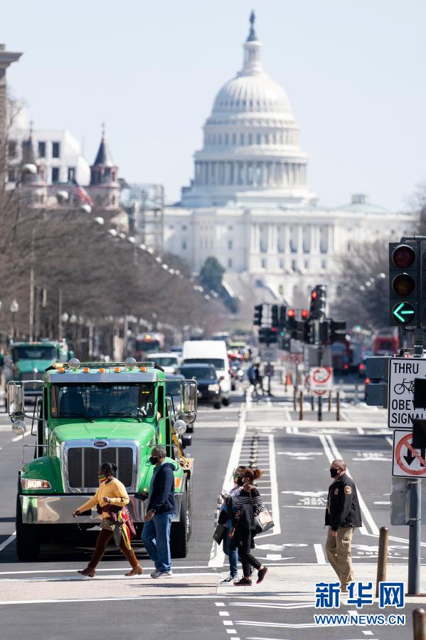 3月10日,在美国首都华盛顿,人们经过国会大厦附近的一处路口。新华社记者刘杰摄