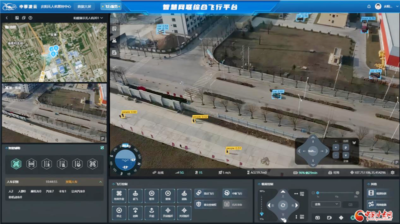 中移凌云平台是无人机监测管理运营的大脑,该平台融合了人工智能、原生云、时空大数据库等关键技术,实现了无人机作业全流程的自动化、智能化管理,为农业、物流、旅游、巡检、消防等多个垂直行业领域提供了高效、可靠的无人机应用解决方案。本次无人机飞行展示可以清晰地在屏幕看到,无人机飞行轨迹,以及地面人、车的数量和动向,及时鉴别黑飞的无人机并作出时时预警。