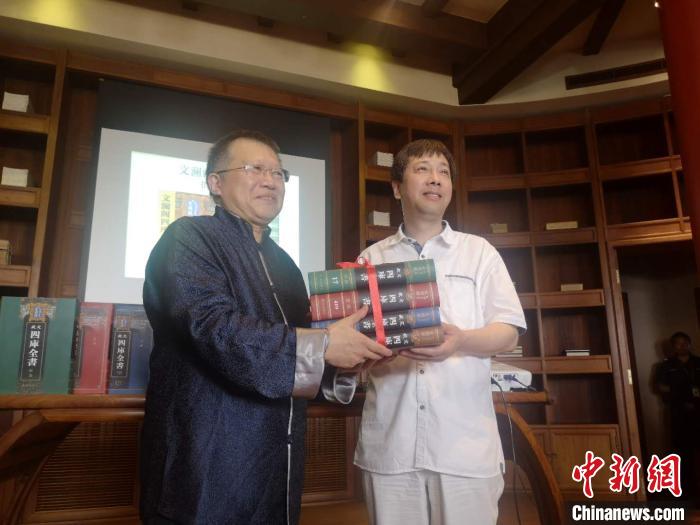 中新网杭州8月26日电(童笑雨)8月26日,浙江图书馆(下称“浙图”)向中国国家图书馆(下称“国图”)赠送影印精装本文澜阁《四库全书》。据悉,影印本文澜阁《四库全书》入藏国图,尚属首次。浙江图书馆馆长褚树青表示,文澜阁本《四库全书》重新回到北京,是浙江人民的回赠,也是一次文化交流。