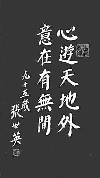 张先生的人生是圆满的。赵朴初《遗嘱》说:“生固欣然,死亦无憾。花落还开,水流不断。我兮何有,谁欤安息?明月清风,不劳寻觅。”弘一法师《辞世二偈》之二说:“华枝春满,天心月圆。”这些遗言,都显示了一种人生圆满的喜悦。张先生书法集中的两句话:“心游天地外,意在有无间。”同样显示了一种人生圆满的喜悦。