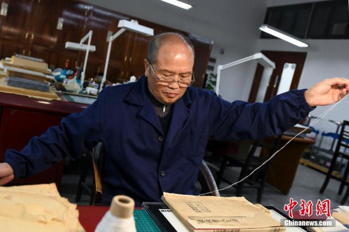 图为师玉祥将修复完成的古籍进行穿线订书。 杨华峰 摄