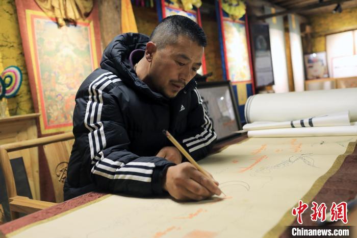 12月22日,在勒通古镇的“唐卡馆”,21岁的洛绒曲扎正在绘制唐卡。中新社记者 王磊 摄