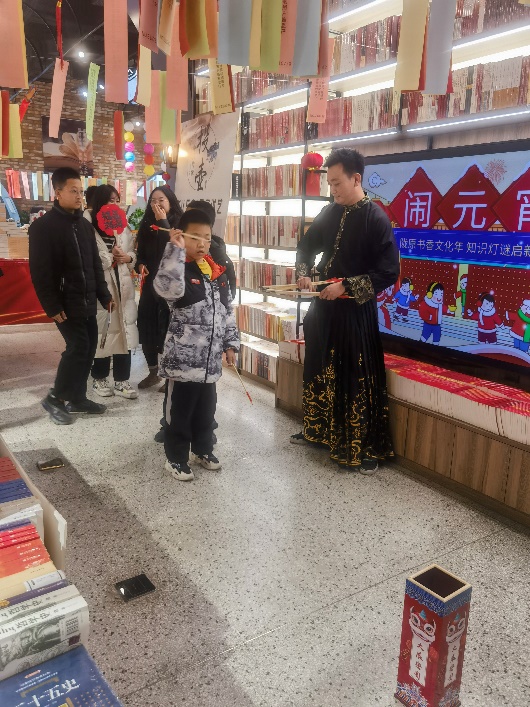 活动当天,书店内五颜六色的灯笼、闪闪发光的年味装饰树、喜庆的心愿签到墙等让大家应接不暇,书店悬挂一条条趣味十足的谜语,也吸引了众多读者围观。