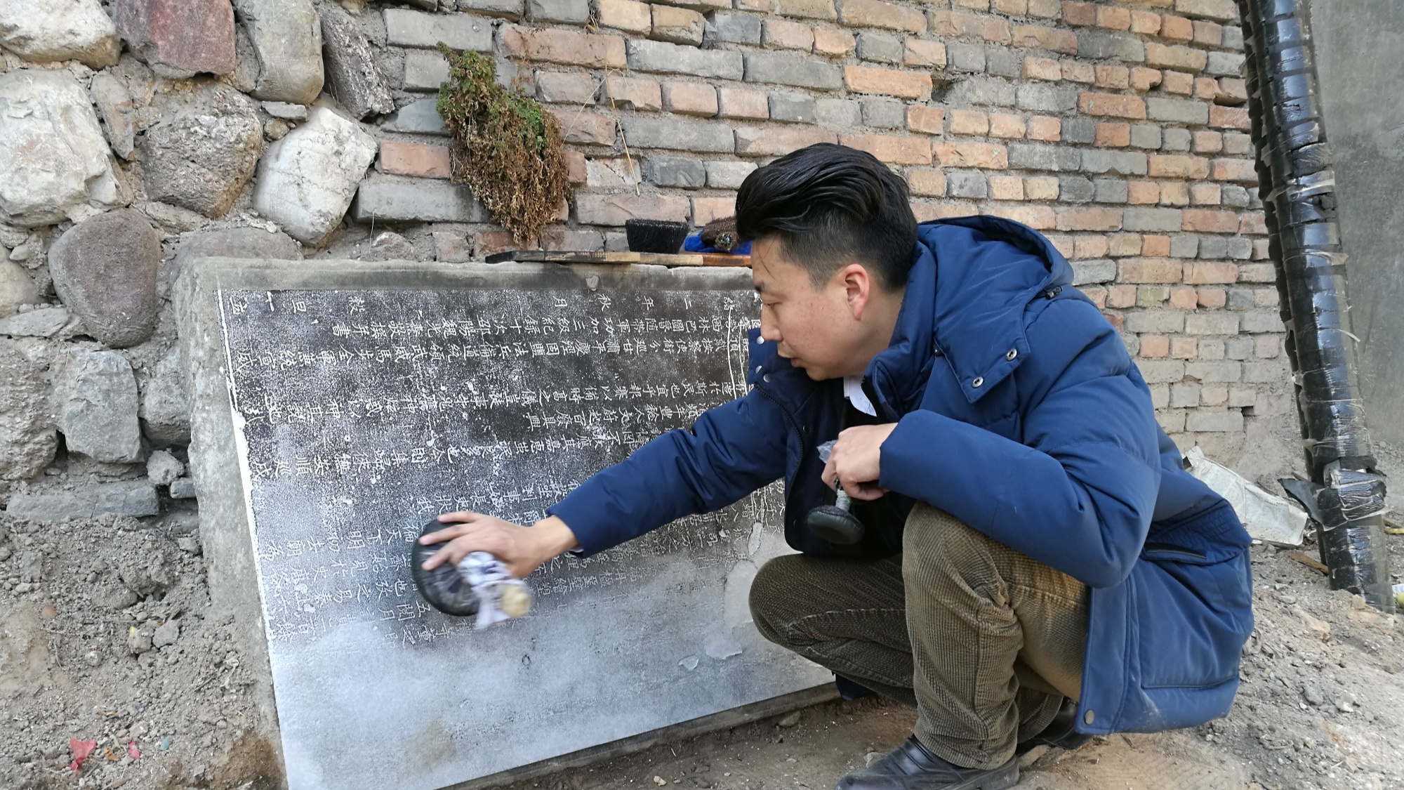 图为张钦仲发现《重修平凉城隍庙碑记》并制作拓片(崆峒区融媒体中心供图)