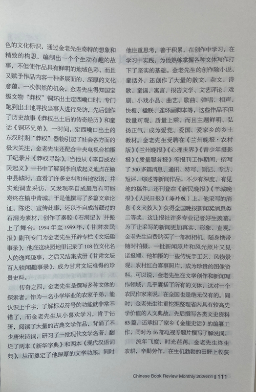 传奇之四,金老先生是撰写多种文体的探索者。作为一名小学毕业的农家子弟,能认识上千字,了解标点符号的功能就非常不错了,而金老先生从小喜欢学习,肯于钻研,阅读了大量的古典文学作品,背诵了不少唐宋诗词,研习了一批现代文学名著,翻烂了两本《新华字典》和两本《现代汉语词典》,从而奠定了他深厚的文学功底。同时他注重思考,善于积累,在创作中学习,在学习中实践,为他熟练掌握各种文体写作打下了坚实的基础。金老先生的创作除小说、童话外,还创作了大量的散文、杂文、诗歌、童谣、寓言、报告文学、文艺评论、戏剧、小戏小品、曲艺、歌曲、弹唱、相声、快板、楹联、连环画脚本等,这些作品不但数量可观、质量上乘,而且主题鲜明、弘扬正气,成为爱党、爱国、爱家乡的乡土教材。金老先生受聘在《兰州晚报·农村版》《兰州晚报》《心理世界》《青少年摄影报》《质量服务报》等报刊工作期间,撰写了300多篇消息、通讯、特写、侧记、专访、短评、综述等新闻作品,不少有深度、有见地的稿件,还刊登在《新民晚报》《羊城晚报》《人民日报》(海外版)上。他采写的消息《义犬救人》获得全国晚报新闻奖消息类二等奖,这让报社许多专业记者好生羡慕。为了让采写的新闻更加真实、形象、直观,金老先生自费购买了一部照相机,随身携带随时拍摄,一批新闻照片和风光照片又见诸报端。他拍摄的一些传统手工艺、风物景观、农村红白喜事照片,成为珍贵的图像资料。可以说,金老先生在文学创作和新闻写作领域,几乎囊括了所有的文体,这对一个农民作家来说,在全国也是绝无仅有的。同时,金老先生注重挖掘整理省内具有较高史学价值的人文典故,先后撰写各类文史资料83篇,还承担了家乡《金崖史话》的编纂工作,同时为16部电视专题片撰写了解说词。