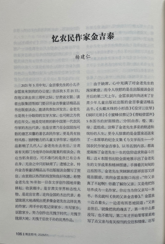 由于缺席,心中充满了对金老先生的深深歉意。而令人欣慰的是在出版座谈会召开后的第二天上午,金雷泉就向我送来了甘肃少年儿童出版社出版的金吉泰童话精品丛书,《头戴水珠的小杉苗》《没牙三弦琴》《铜环兄弟》《小蜜蜂侦察记》《青蛙借雷声》5本图书的封面颜色,分别由赤、橙、黄、绿、蓝组成,诠释了金老先生多彩的轨迹和缤纷的人生。更令人惊喜的是金雷泉还送来了一本厚厚的纪念文集《为文学而生——中国农民作家金吉泰》,从书名到内容,都高度凝练了金老先生一生的信仰追求和奋斗历程,这6本图书比较全面地展示出了金老先生的文学成果和精神图谱。手捧着沉甸甸的这些图书,金老先生笑眯眯的慈祥面容又浮现在眼前,我向金雷泉脱口而出:“你父亲真了不起啊!你最了解你父亲,又是他把你培养成为一名作家,你应当为你父亲写一本书,书名就叫《我的父亲金吉泰》。”金雷泉一边点着头,一边若有所思地说道:“父亲去世后,就像把我的魂丢了,第一年什么都没写,也不敢写,第二年才开始零零星星地写了点父亲与有关报刊的交往和情缘,还写了点父亲在生活和写作中的轶事趣闻。您的建议非常好,我担心驾驭不好,试试看吧。”我感觉金雷泉有点为难,马上又安慰他:“不急,你用两三年时间慢慢写。”