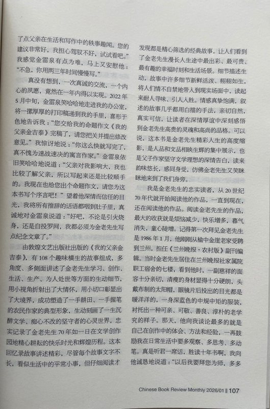 由敦煌文艺出版社出版的《我的父亲金吉泰》,有108个趣味横生的故事组成,多角度、多侧面讲述了金老先生学习、创作、生活、生产、为人处世等方面的生动细节,用小视角折射出了大情怀,用小切口彰显出了大境界,成功塑造了一手耕田、一手握笔的农民作家的典型形象,生动刻画了一生沉醉文学、痴心不改的坚守者的心灵世界,忠实记录了金老先生70年如一日在文学创作园地精心耕耘的快乐时光和辉煌历程。这本回忆录故事讲述精彩,尽管每个故事文字不长,看似生活中的平常小事,但仔细阅读才发现都是精心筛选的经典故事,让人们看到了金老先生漫长人生途中最出彩、最可贵、最有趣的幸福时刻和生活场景。细节描述生动,故事中许多细节新鲜活泼、栩栩如生,将人们情不自禁地带入到现实场面中,读起来耐人寻味、引人入胜。情感真挚饱满,叙述的故事几乎都用白描的手法,亲切自然,真实可信,让读者在深情厚谊中深刻感悟到金老先生高贵的灵魂和高尚的品格。可以说,这本书是金老先生精彩人生的高度缩影,是人品和文品相映生辉的集中展示,也是父子作家坚守文学理想的深情告白,读来韵味悠长,感同身受,仿佛金老先生又笑眯眯地来到了我们身旁。