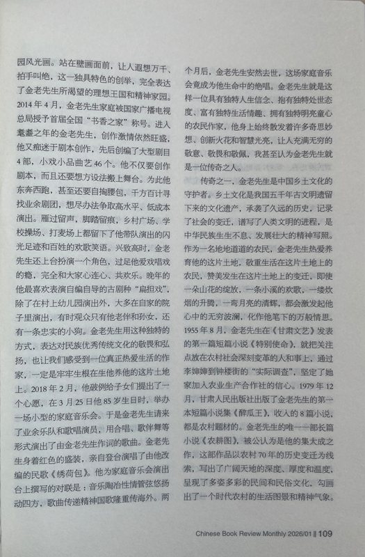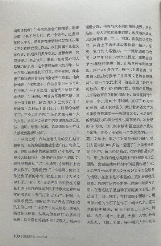 从此之后,我与金老先生的交往越来越密切,交流的话题也越来越广泛,每次见面,他给我最多的就是鼓励:“小杨啊,你在《人民日报》上发表的写奥运会的散文,看得我都激动了。”“小杨啊,《诗刊》上发表大作了,值得祝贺!”“小杨啊,你的创作达到了新的水准,都登上国刊《人民文学》了。”有一次,金老先生得知我在《星星》诗刊举办的首届农民工诗歌大奖赛中获奖的消息后,专门打来电话:“小杨啊,向你表示祝贺,你的获奖作品表达了我们农民工的心声!”金老先生与人相处,传递的绝对是正能量,从我与他交往的30多年时光里,从来没有听到过他非议别人。后来才慢慢发现,他有与众不同的精神境界、质朴品格、为人方式和处事态度,他灵魂深处永远流淌着向善、向上、向真、向美的价值取向,浑身上下始终洋溢着执着、豁达、乐观、宽容的人格魅力。一个地地道道的农民,从当年只有小学文化程度,靠勤奋自学70年坚持笔耕不辍,出版各种作品集25部,共计400多万字,被中共甘肃省委、甘肃省人民政府授予“甘肃省文艺终身成就奖”。对一个农民来说,这在全国也是屈指可数的。年近80岁的时候,在患严重眼疾几乎导致双目失明的情况下,每天坚持写作两三千字,用10个月时间,完成了45万字的长篇小说《农耕图》,荣获甘肃省文学艺术类政府最高奖——敦煌文艺奖,金老先生的顽强毅力和拼命劲头也是罕见的。20世纪80年代初,他以家乡榆中县金崖乡文化站为依托,创办了全省第一个农民文学社——苑川文学社,举办“文学创作讲习班”,吸引方圆村镇100多名“泥腿子”文学爱好者参与其中,每当经他修改、推荐的作品发表后,年过半百的他总是骑上自行车跑几十公里路,喜滋滋地将样报样刊送到作者手里,金老先生乐此不疲为文学爱好者全方位服务的情怀,在当下是不多见的,更加显得弥足珍贵。兴趣广泛的金老先生在晚年时突发奇想,在老宅院子里启动了家庭美化工程,自己设计、自己施工,在自家院子西墙上,用五颜六色的小石子创作了一幅长八米、宽二米的巨型壁画,画面上有红日、山水、碌碡、西瓜、树木、小鹿、大雁、人物,还有太阳灶、飞机、卫星,好一幅天人合一的田园风光画。站在壁画面前,让人遐想万千、拍手叫绝,这一独具特色的创举,完全表达了金老先生所渴望的理想王国和精神家园。2014年4月,金老先生家庭被国家广播电视总局授予首届全国“书香之家”称号。进入耄耋之年的金老先生,创作激情依然旺盛,他又痴迷于剧本创作,先后创编了大型剧目4部,小戏小品曲艺46个。他不仅要创作剧本,而且还要想方设法搬上舞台。为此他东奔西跑,甚至还要自掏腰包,千方百计寻找业余剧团,想尽办法争取高水平、低成本演出。雁过留声,脚踏留痕,乡村广场、学校操场、打麦场上都留下了他带队演出的闪光足迹和百姓的欢歌笑语。兴致高时,金老先生还上台扮演一个角色,过足他爱戏唱戏的瘾,完全和大家心连心、共欢乐。晚年的他最喜欢表演自编自导的古剧种“扁担戏”,除了在村上幼儿园演出外,大多在自家的院子里演出,有时观众只有他老伴和孙女,还有一条忠实的小狗。金老先生用这种独特的方式,表达对民族优秀传统文化的敬畏和弘扬,也让我们感受到一位真正热爱生活的作家,一定是牢牢生根在生他养他的这片土地上。2018年2月,他破例给子女们提出了一个心愿,在3月25日他85岁生日时,举办一场小型的家庭音乐会。于是金老先生请来了业余乐队和歌唱演员,用合唱、歌伴舞等形式演出了由金老先生作词的歌曲。金老先生身着红色的盛装,亲自登台演唱了由他改编的民歌《绣荷包》。他为家庭音乐会演出台上撰写的对联是:音乐陶冶性情管弦悠扬动四方,歌曲传递精神国歌隆重传海外。两个月后,金老先生安然去世,这场家庭音乐会竟成为他生命中的绝唱。金老先生就是这样一位具有独特人生信念、抱有独特处世态度、富有独特生活情趣、拥有独特明亮童心的农民作家,他身上始终散发着许多奇思妙想、创新火花和智慧光亮,让人充满无穷的敬意、敬畏和敬佩,我甚至认为金老先生就是一位传奇之人。