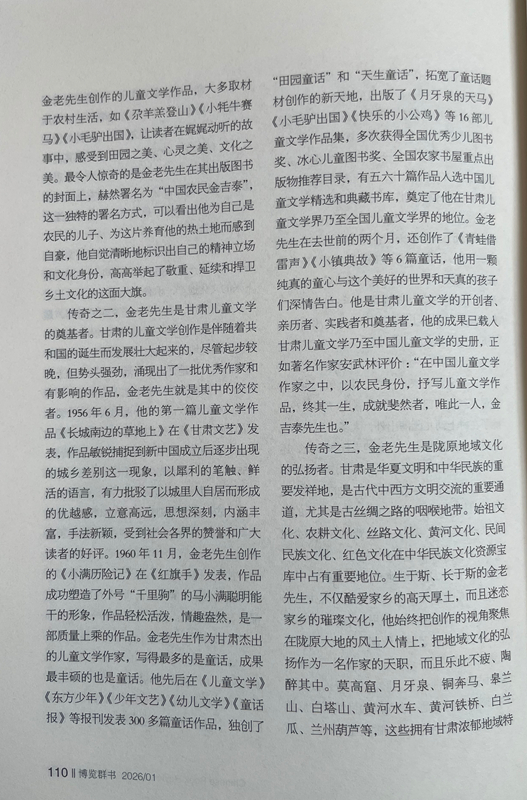 传奇之二,金老先生是甘肃儿童文学的奠基者。甘肃的儿童文学创作是伴随着共和国的诞生而发展壮大起来的,尽管起步较晚,但势头强劲,涌现出了一批优秀作家和有影响的作品,金老先生就是其中的佼佼者。1956年6月,他的第一篇儿童文学作品《长城南边的草地上》在《甘肃文艺》发表,作品敏锐捕捉到新中国成立后逐步出现的城乡差别这一现象,以犀利的笔触、鲜活的语言,有力批驳了以城里人自居而形成的优越感,立意高远,思想深刻,内涵丰富,手法新颖,受到社会各界的赞誉和广大读者的好评。1960年11月,金老先生创作的《小满历险记》在《红旗手》发表,作品成功塑造了外号“千里驹”的马小满聪明能干的形象,作品轻松活泼,情趣盎然,是一部质量上乘的作品。金老先生作为甘肃杰出的儿童文学作家,写得最多的是童话,成果最丰硕的也是童话。他先后在《儿童文学》《东方少年》《少年文艺》《幼儿文学》《童话报》等报刊发表300多篇童话作品,独创了“田园童话”和“天生童话”,拓宽了童话题材创作的新天地,出版了《月牙泉的天马》《小毛驴出国》《快乐的小公鸡》等16部儿童文学作品集,多次获得全国优秀少儿图书奖、冰心儿童图书奖、全国农家书屋重点出版物推荐目录,有五六十篇作品入选中国儿童文学精选和典藏书库,奠定了他在甘肃儿童文学界乃至全国儿童文学界的地位。金老先生在去世前的两个月,还创作了《青蛙借雷声》《小镇典故》等6篇童话,他用一颗纯真的童心与这个美好的世界和天真的孩子们深情告白。他是甘肃儿童文学的开创者、亲历者、实践者和奠基者,他的成果已载入甘肃儿童文学乃至中国儿童文学的史册,正如著名作家安武林评价:“在中国儿童文学作家之中,以农民身份,抒写儿童文学作品,终其一生,成就斐然者,唯此一人,金吉泰先生也。”