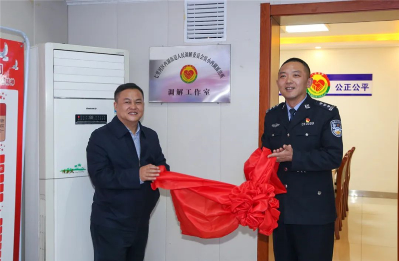 继2022年3月七里河分局17个户籍派出所所长和130社区民警全部进乡镇(街道)和社区(村)两委班子之后,2023年4月,17个户籍派出所全面建成乡镇街道人民调解委员会派驻公安派出所调解工作室,并冠以“百合(和)调解室”的名称作为调解室工作品牌(寓意为百事好合、社会和谐),七里河分局联合七里河区司法局集中举行了启动仪式。
