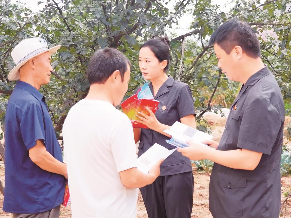 三河法庭干警深入田间地头,向村民发放法律宣传手册。武都区法院供图