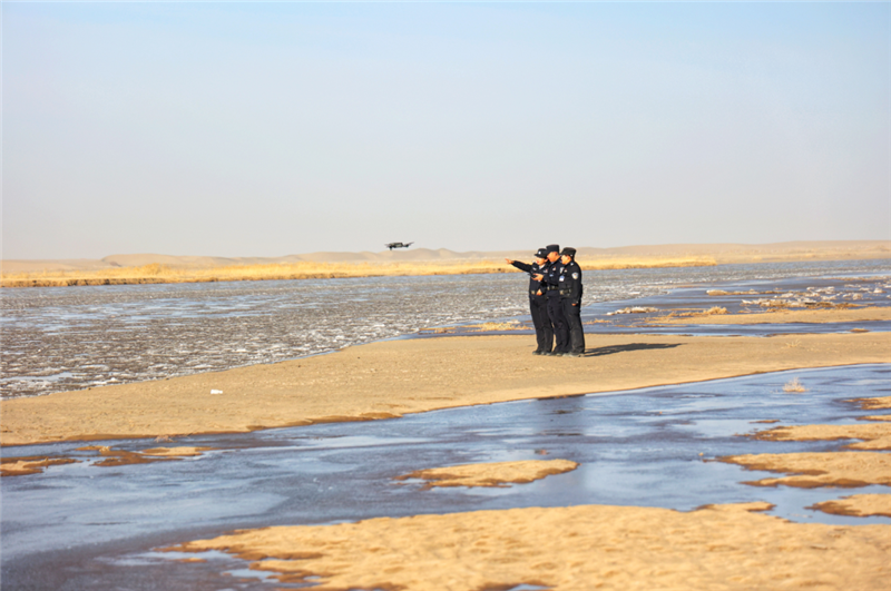 ▲金塔县公安局城关派出所民辅警深入辖区生态保护区开展车巡、步巡、无人机巡,构建起全域覆盖、空地联动、精准高效的生态安全防控体系,为织密生态保护网保驾护航。(葛万誉 摄)