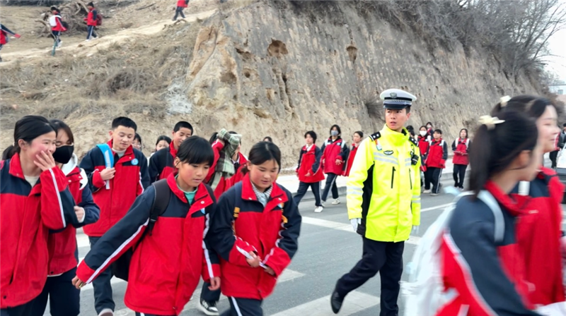 ▲东乡县公安局民辅警开展护学工作,重点在校园周边开展交通疏导、清理违停车辆、引导学生安全过马路。(完玛草 摄)