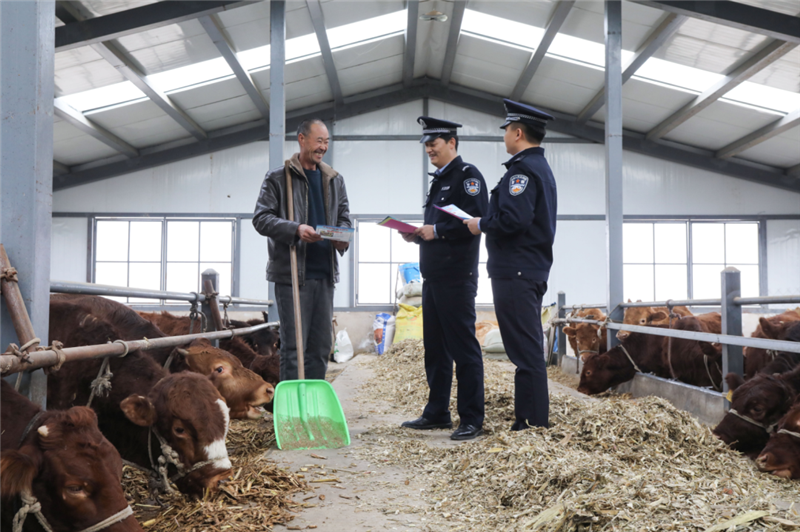 ▲平凉市公安局崆峒分局寨河派出所民辅警深入辖区红牛养殖基地,开展针对性普法宣传活动,进一步筑牢辖区红牛养殖产业法治防线,提升广大养殖户的法律意识。(张镜镜 摄)