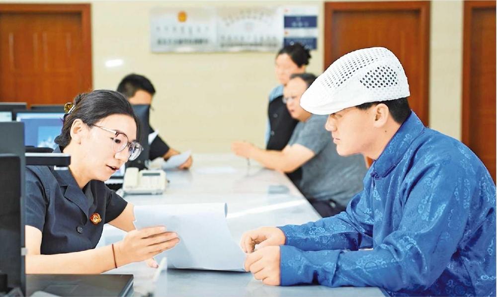 肃北县人民法院立案庭蒙汉双语法官助理接待当事人(2025年8月拍摄)。