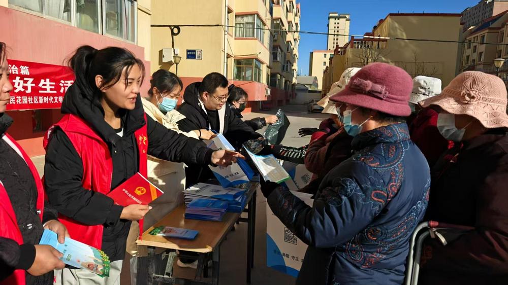 工作人员在社区内开展普法宣传活动,向居民发放法律宣传资料。
