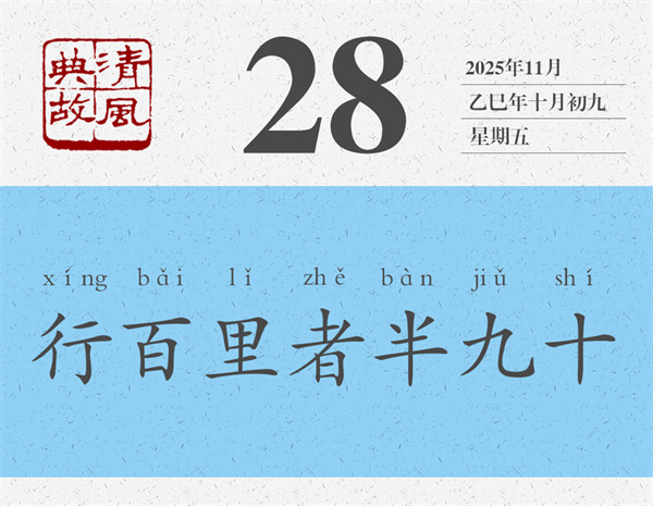 后人即以“行百里者半九十”为典,比喻做事情越到最后越困难,越接近成功越要认真对待。黄庭坚杂言诗《赠元发弟放言》:“亏功一篑,未成丘山。凿井九阶,不次水泽。行百里者半九十,小狐汔(qì)济濡其尾。故曰时乎,时不再来。终终始始,是谓君子。”全诗几乎都在阐释“行百里者半九十”。其中还用了《周易》中的一个比喻:小狐狸过河时,几乎就要过去了,但因为拼命挣扎,还是弄湿了尾巴。