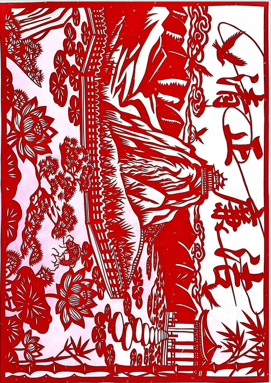 “清正廉洁”剪纸作品以西和县晚霞湖的荷塘为背景,借荷花“出淤泥而不染”的形象比喻清正廉洁。