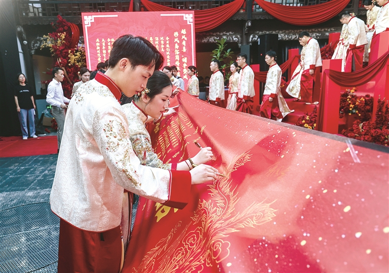 风成于上、俗化于下。近年来,越来越多新人选择集体婚礼,倡导文明简约的婚嫁理念,通过精心设计的集体婚礼仪式,打造既庄重又温馨的婚礼体验,既减轻经济负担、又传承美好家风,倡导婚俗改革文明新风尚。图为在浙江省诸暨市西施故里景区内,参加集体婚礼仪式的新人们签订移风易俗简婚承诺。新华社记者 徐昱 摄