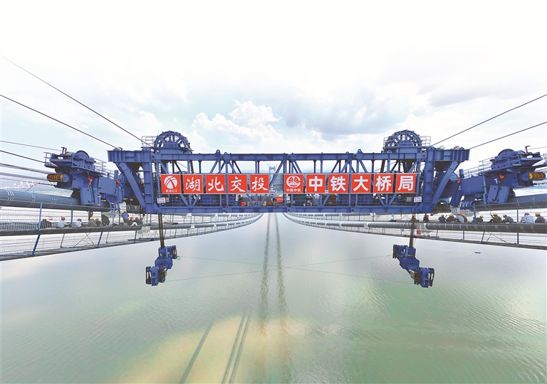 那就自己创造经验!湖北交投牵头联合承建单位,在大桥建设前期进行了大量数据论证和可行性试验,一次次研究优化施工方案。他们坚持设备优化与工艺创新“双管齐下”,应用缆载吊机、液压提升装置等装备创新施工方法,顺利攻克了难关。