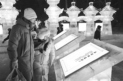 黑龙江省哈尔滨市依托冰雪文化资源创建廉洁品牌,打造含有清廉元素的冰雪景观园,让市民游客在赏冰乐雪的同时受到廉洁文化的浸润。图为市民在冰雪景观前驻足。 刘萌 摄