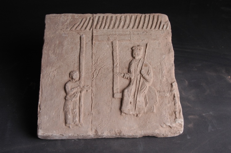 宋代。纵30.2厘米,横30.7厘米,厚3厘米。征集。砖呈长方形,青灰色,通过模印工艺展示了屋檐下一妇人坐于窗台前,给一端物的幼子训话的场景,是研究宋代社会生活、家庭伦理及画像砖艺术的珍贵实物资料。