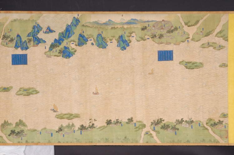 清代,纵59.7厘米,横1340厘米。采用传统技法绘制,上南下北,凡江水、港泊、洲渚、城池、村落、林木、山石、舟车、人物、旗幡、军械均以立体形象呈现,饰以石青、石绿等多种颜色。上起九江、下至镇江,千里区域中列拦江缆、拦江牌、战船、木楼、烟墩、驻军地、营等各种军事设施,每营均有金书大榜题,记述本营所处位置及兵力布置状况,每汛的标题上还记有汛与汛之间的里数。