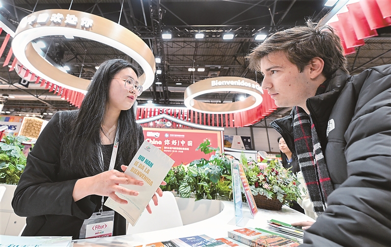 近年来,过境免签政策持续扩容、免税购物政策不断优化、“即买即退”适用商店持续增加……得益于中国日益开放的举措,越来越多外国游客在中国旅游、购物,感受更加开放包容、多元创新的中国。图为1月21日至25日举行的马德里国际旅游展上,参观者在中国展台咨询。新华社记者 程敏 摄