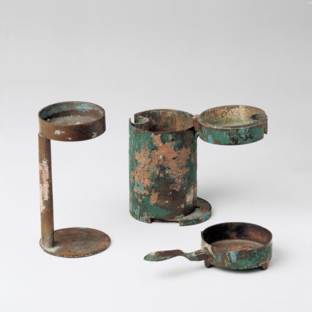 汉代,秦安县出土。高14.5厘米,径6.9厘米。灯呈筒状,有盖,盖为二层,上层三钮,侧有活柄,连以活铆,翻转成灯盘。灯身呈圆筒形,一侧有半圆柱形凹槽,底为三层,中层系半活动底,以半圆柱轴相连接。第二层灯盘可转动。全器能旋转启合,设计别致,制作精巧。