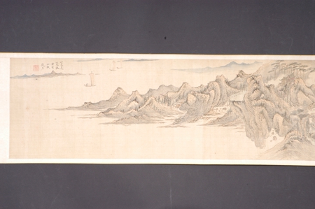 明代,设色山水长卷,作者赵左,绢本。纵高33.5厘米,横宽230厘米。款署“丁巳长夏仿黄鹤山樵赵左”,钤“赵左之印”白文方印。引首孙谋书题“江村僻幽”,卷中绘万壑千岩、奇峰危石、深涧幽谷、长河帆影、茂林烟树、孤村崇阁、云泉溪桥……正是作者理想中的归隐之所。赵左(1573年-1644年),明代华亭(今上海松江)人,字文度,松江派重要画家。