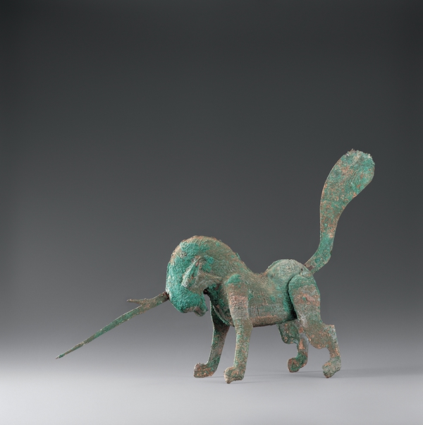 汉代,酒泉市出土,一级文物。俯首含胸,颈部高耸,头生独角,角向前刺,扁尾高扬,四足跨张作角斗状,全身铸有兽毛纹饰,姿态威严,仿佛随时准备跃起。它是中国古代文化中能够分辨善恶曲直的“正义的化身”——獬豸。