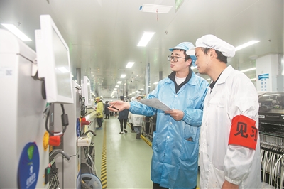 在浙江省杭州市上城区海兴电力科技股份有限公司车间内,工程师对见习员工进行培训。新华社记者 江汉摄