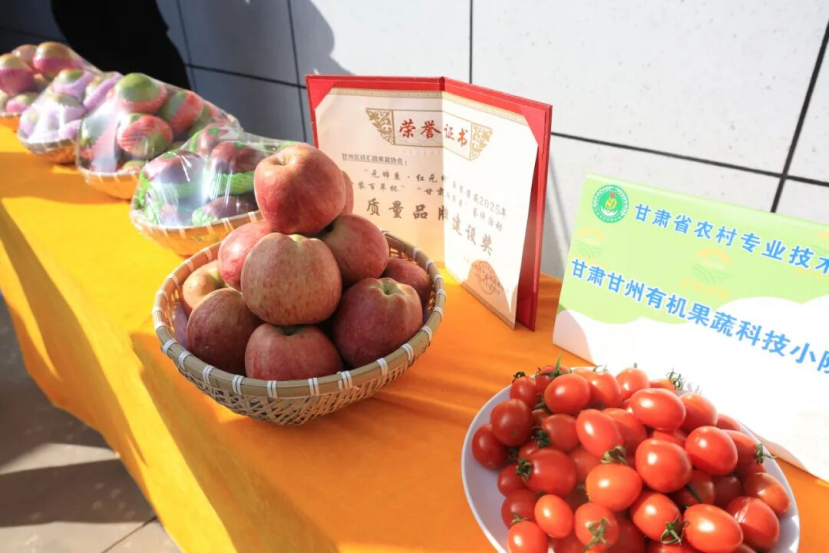 科技小院展台上一块红色的证书上清晰地标注着“质量品牌建设奖”字样,旁边摆放着获奖的苹果和小番茄样品。2025年,小院培育的“元帅系·红元帅”苹果荣获“甘农百萃杯·甘肃好苹果”鉴评活动质量品牌建设奖。品牌的提升,直接带动了产品价值的提高。