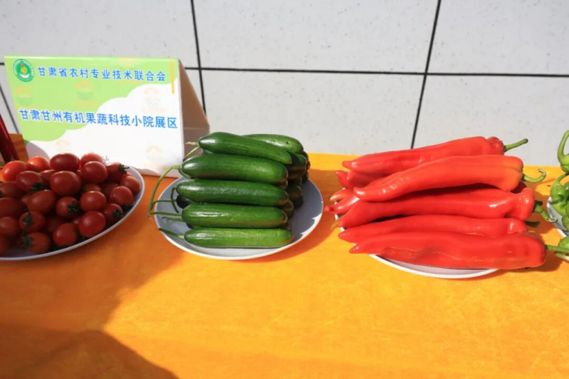 在科技小院内,铺着橙色桌布的展台上,整齐地摆放着小番茄、黄瓜和长辣椒等各类新鲜农产品,背后的展板上,清晰地标注着“甘肃甘州有机果蔬科技小院展区”字样。这种专业化的展示方式,有效地提升了产品的市场形象,增强了消费者的购买信心。
