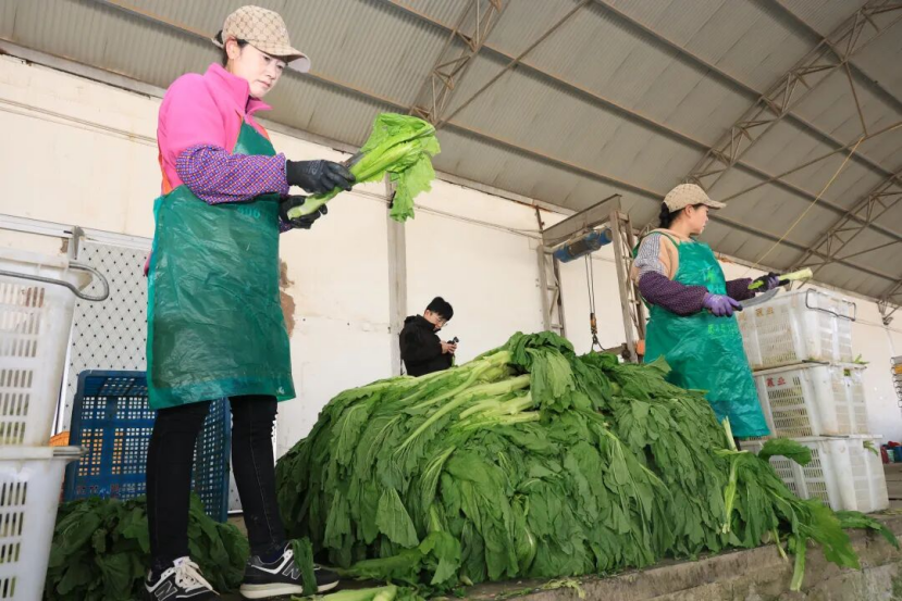 彭建霞是附近村子的村民,如今已是经验丰富的“菜工”。她熟练地砍菜根、剥粗叶,脸上洋溢着幸福的笑容。“以前为了生计,只能背井离乡。现在好了,家里的土地流转了,我在家门口就能打工,每天100多元,还能照顾家里的老小。”