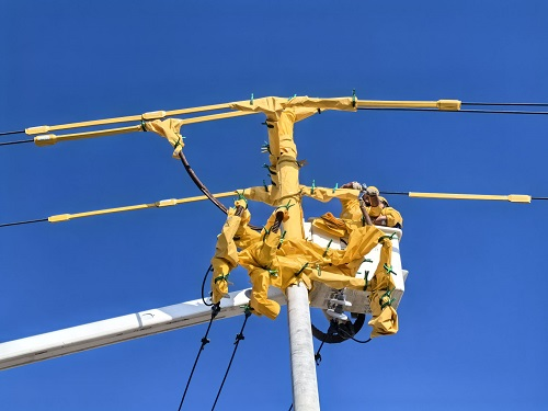 作业现场,严寒逼人,但准备井然有序。该公司相关负责人提前组织现场勘查,制定“三措一案”,反复预演操作流程。绝缘斗臂车、绝缘手套、遮蔽毯等器具逐一检查确认,确保万无一失。上午11时10分,两名作业人员穿戴好绝缘防护装备,乘绝缘斗臂车缓缓升至12米高空,逐步对导线、横担、杆塔等带电部位进行绝缘遮蔽,构建起安全作业屏障。随后,他们依照标准化作业指导,沉稳细致地完成三相引流线的搭接工作。