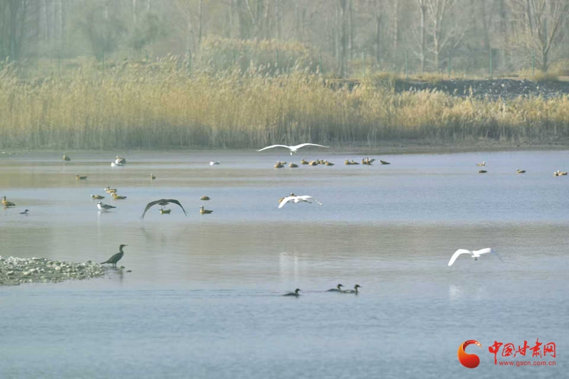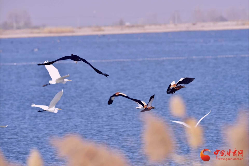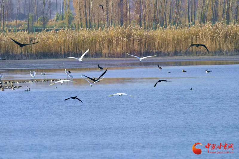 11月10日,初冬寒意渐浓,临泽流沙河景区与双泉湖水库芦苇丛间,响起迁徙鸟类的“集结号”。洁白的白鹳舒展双翼、翩跹飞舞,成群麻鸭、鸬鹚紧随而至,齐聚水域与苇荡之间,为初冬景致添上灵动一笔,引得市民游客驻足抓拍。