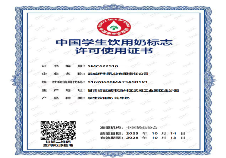 高效推进的背后,是党建引领的强劲引擎,更是企业担当的生动诠释。从完成材料填报提交,到顺利通过材料审查,再到圆满完成现场审核、进入公示阶段,武威伊利仅用37天就完成了全流程申报,成功获取“中国学生饮用奶标志许可使用证书”,创造了学生奶资质申请的“伊利速度”传奇,这不仅是对伊利产品品质的充分认可,更彰显了党建赋能的硬核实力。