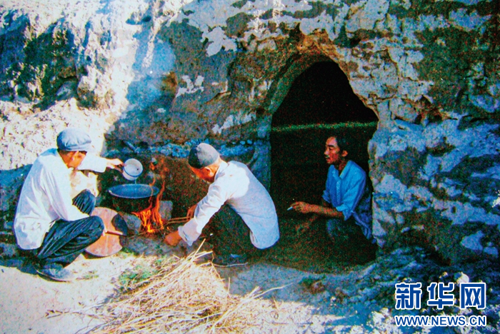 1983年,“六老汉”第一代治沙人在“地窝子”生火做饭(资料图片)。(八步沙林场供图)