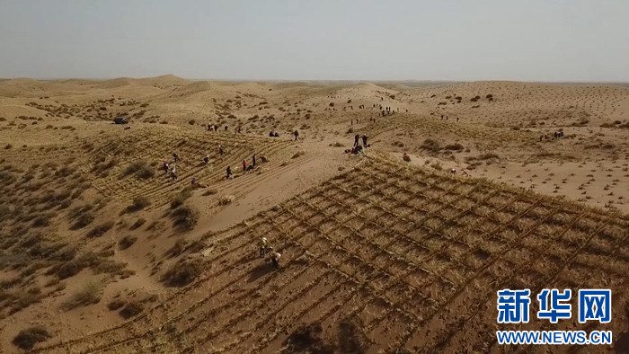 图为甘肃省武威市古浪县八步沙林场在扎草方格压沙(资料图片)。新华网发(童张伟 摄)