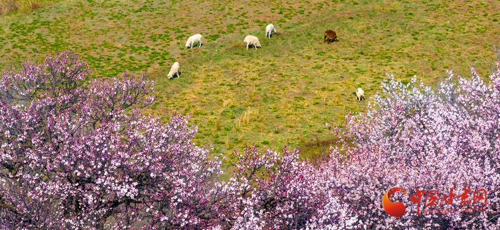 翠绿草地上,羊群悠然啃食青草,与烂漫花海相映成趣