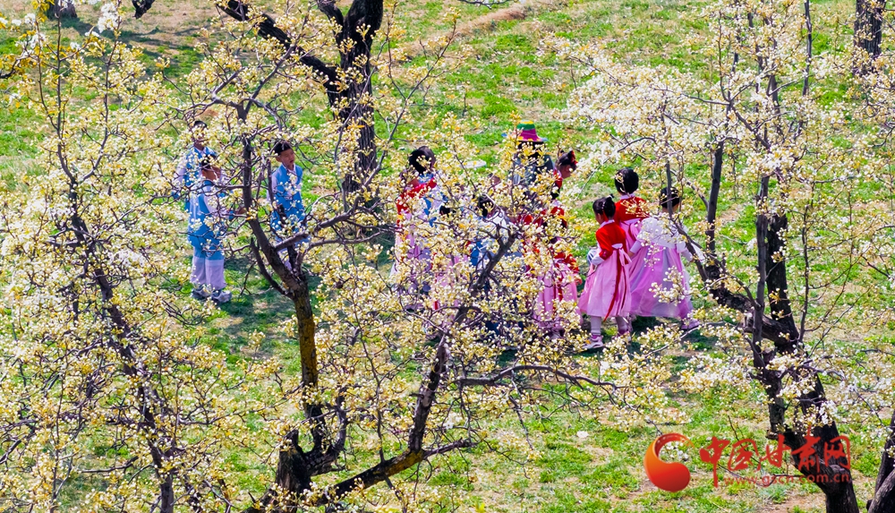 身着绚丽服饰的孩童在梨花树下玩耍,衣袂飘飘,尽显春日踏青的悠然意趣
