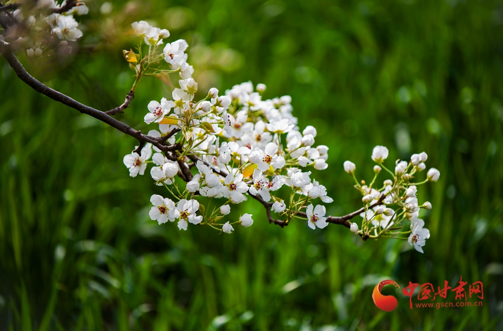 素白花瓣缀满枝桠,嫩蕊轻颤,似落雪凝霜,又似春的音符