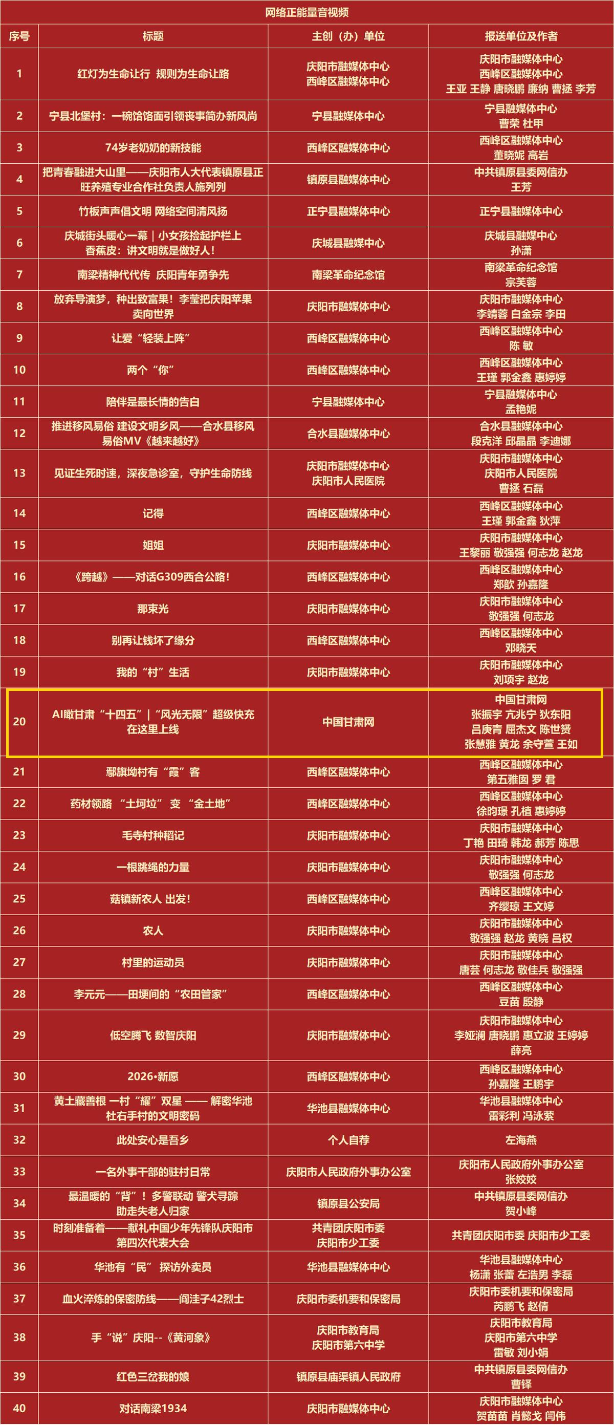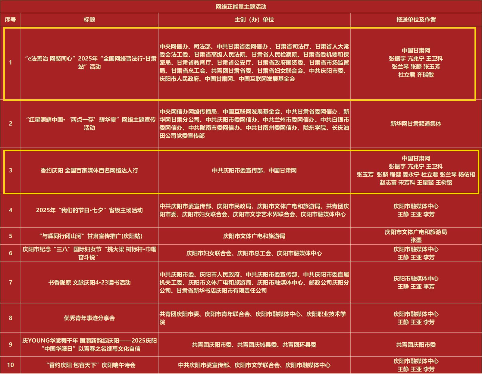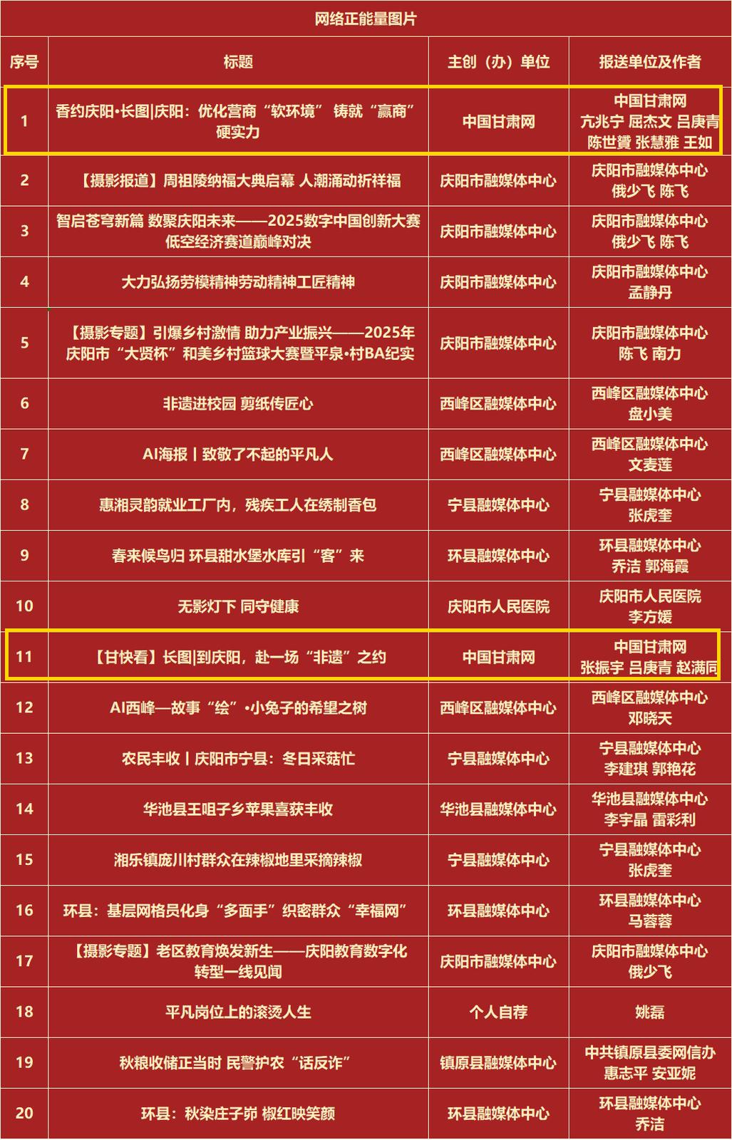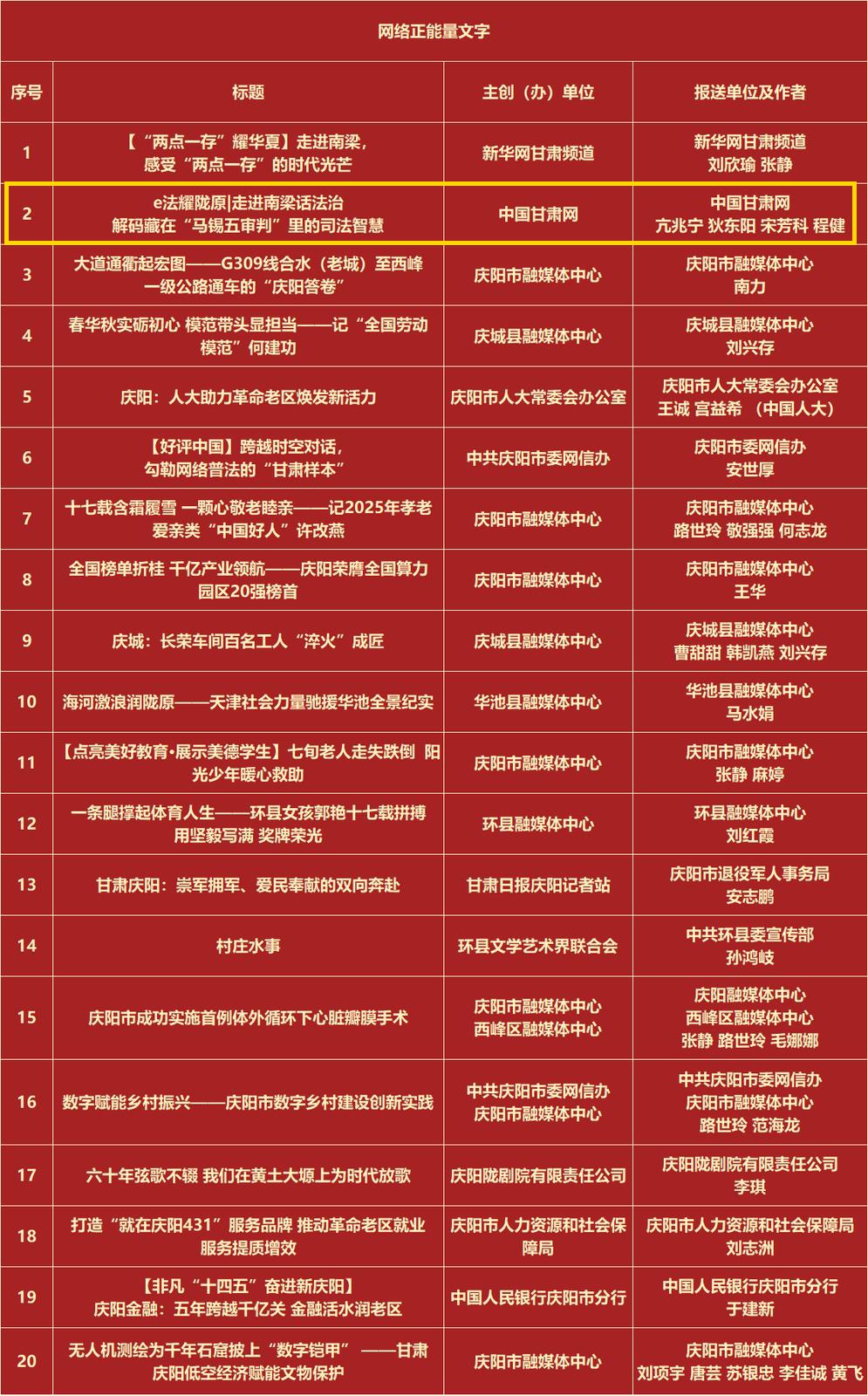 活动自启动以来,得到了社会各界的广泛关注和积极参与。入选作品涵盖了文字、图片、音视频、专题专栏等多种类型的网络正能量精品,既有感人至深的奋斗故事,展现了庆阳人民在新时代背景下的拼搏与进取;也有富有创意的网络文化产品,以新颖的形式和独特的视角传递了正能量。其中,中国甘肃网选送的作品在本次评选中脱颖而出,荣获多个奖项。《e法耀陇原|走进南梁话法治 解码藏在“马锡五审判”里的司法智慧》获得网络正能量文字作品;《香约庆阳·长图|庆阳:优化营商“软环境” 铸就“赢商”硬实力》《【甘快看】长图|到庆阳,赴一场“非遗”之约》获得网络正能量图片作品;《AI瞰甘肃“十四五”|“风光无限”超级快充在这里上线》获得网络正能量音视频作品;《“e法善治 网聚同心”2025年“全国网络普法行·甘肃站”活动》《香约庆阳 全国百家媒体百名网络达人行》获得网络正能量主题活动。
