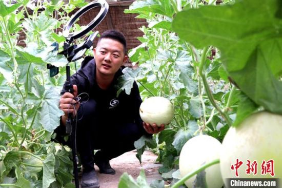图为农村主播梁廷锐直播“带货”甘肃民勤蜜瓜。 马爱彬 摄