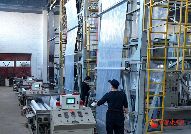 在金塔县民富地膜厂的地膜生产车间里,3条吹塑生产线高速运转,机器轰鸣声此起彼伏。8米高的吹膜口处,优质农用薄膜如白色瀑布般“喷涌”而出,自上而下均匀缠绕在卷筒上;工人们娴熟穿梭,收卷、称重、包装等工序衔接流畅,一卷卷检验合格的地膜被整齐码放成垛,静待发往田间地头。