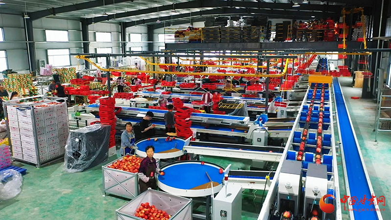 在崇信县柏树镇果品智能化分选线,只见几十名工人有条不紊在分选线上忙碌着,一个个红彤彤的苹果通过圆形硅胶托盘运上流水线,经过检测通道,按照重量、果型、甜度等被分成了数个等级,根据不同等级都会有一个二维码,最终流转到不同端口进行分拣、装箱,平均每小时分选2吨苹果。这个时候上市销售的苹果甜度、口感比前段时间要更好一些,苹果在气调库中最适宜的温度条件下保存,水分和口感都达到了最好状态。为了不错过苹果的最佳食用时间,车间工人加班加点,以最快的速度将苹果装车发运,让优质的崇信苹果及时送到消费者手中。