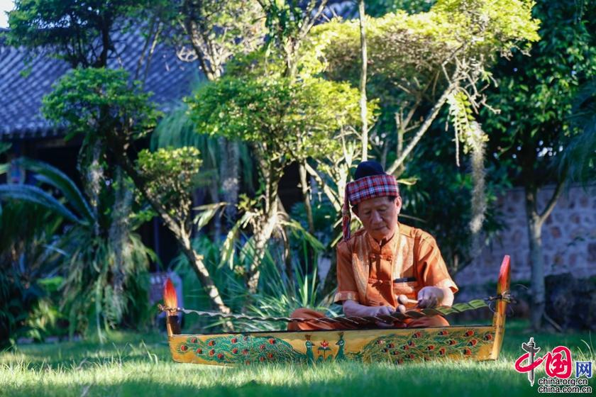 在一个阳光明媚的午后,摄制组来到宣抚司,只见一名老者席地而坐,身前正是傣族特有的钢片琴,身旁礼仪乐舞队已换上庆典服饰。作为一种古老的演出形式,宣抚礼仪乐舞是从傣族民间传进土司府的歌舞艺术。当老者奏响手中钢片琴时,清脆响亮的声音瞬间化作庄重大气的舞台布景,舞者们伴着节奏翩翩起舞,先后展示了长指甲舞、孔雀舞等特色舞蹈。这一充满仪式感的演出在当地已流传近700年,以前只有在孟连傣族土司的重要庆典和节日活动上才能一睹其真容。