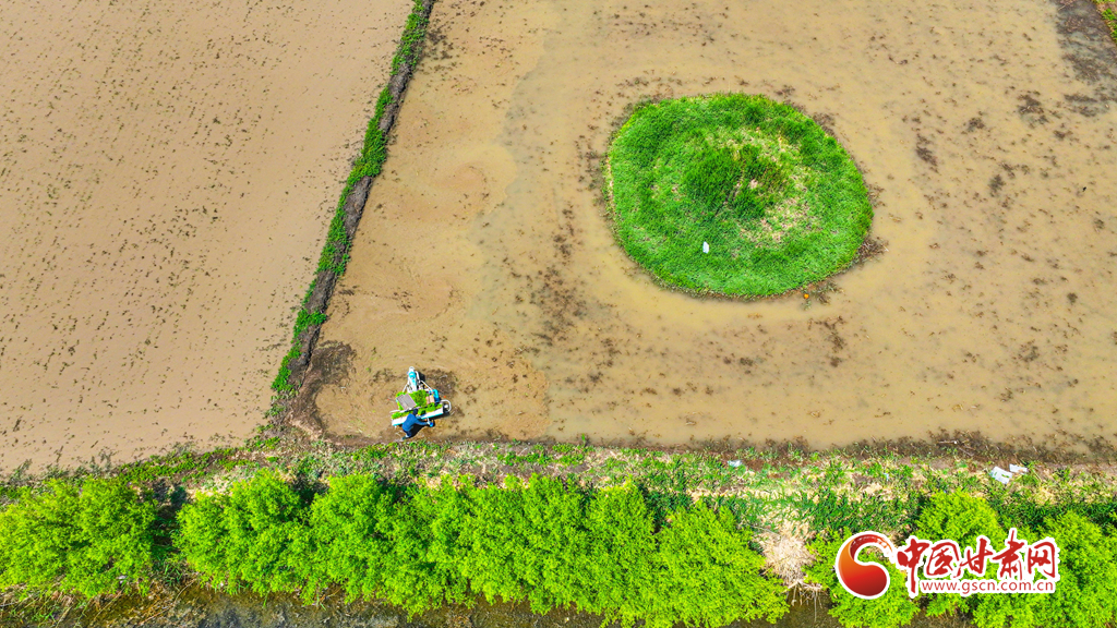 6月5日,祁连山北麓,甘肃省张掖市甘州区乌江镇、靖安乡的稻田里,插秧机同农户来回穿梭插秧,2200多亩稻田进入了繁忙插播中。